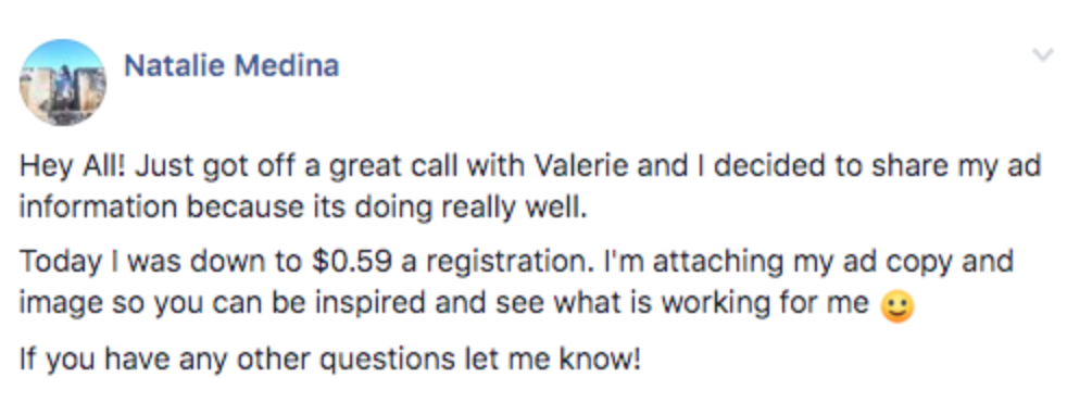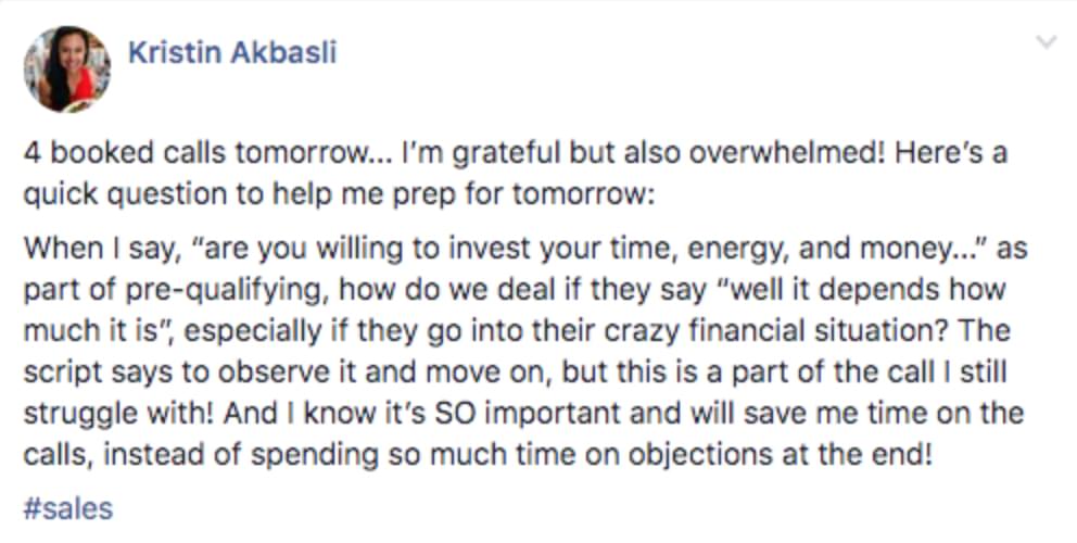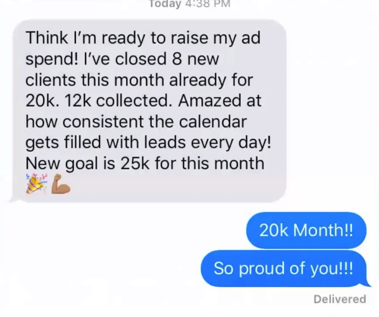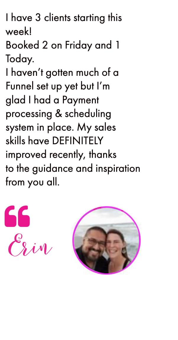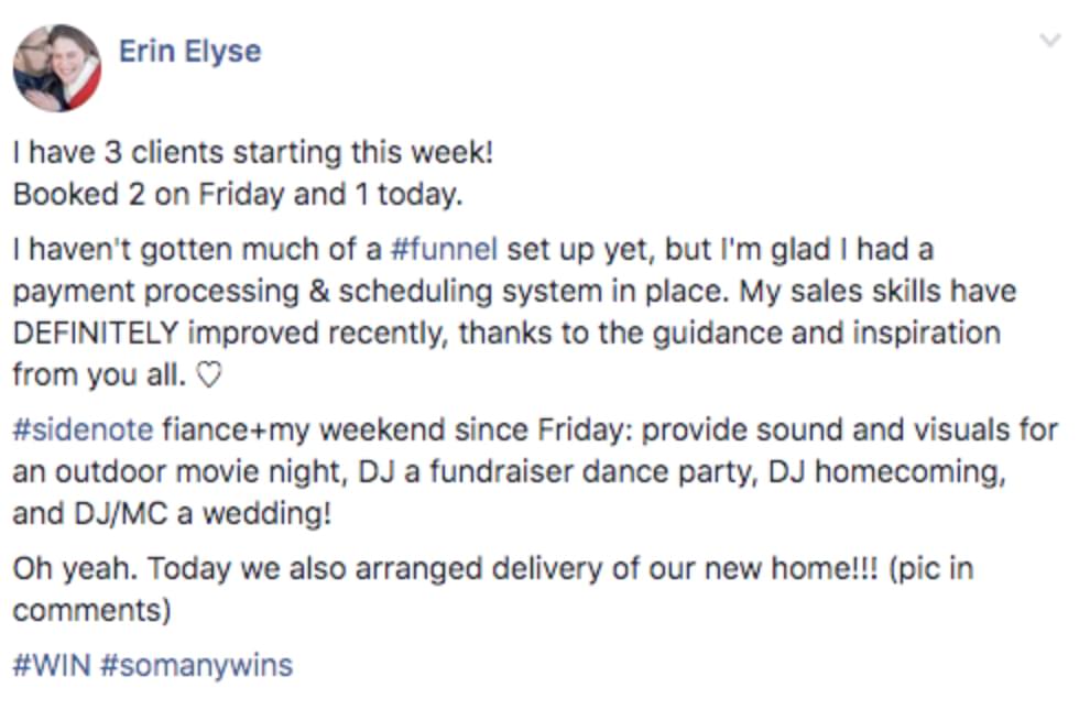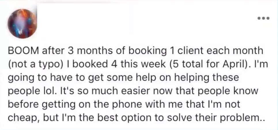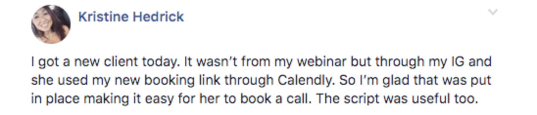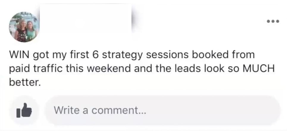 - "WIN! Got my first 6 strategy sessions booked from paid traffic this weekend and the leads look so MUCH better."