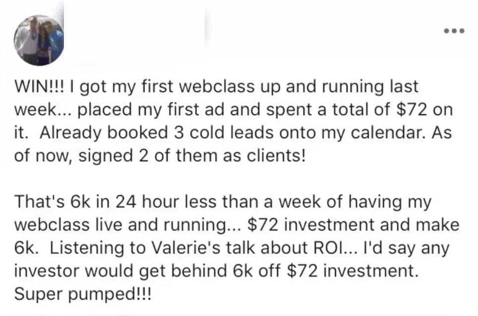 - "WIN! I got my first webclass up and running last week... Placed my first ad and spent a total of $72 on it. Already booked 3 cold leads onto my calendar. As of now, signed 2 of them as clients!